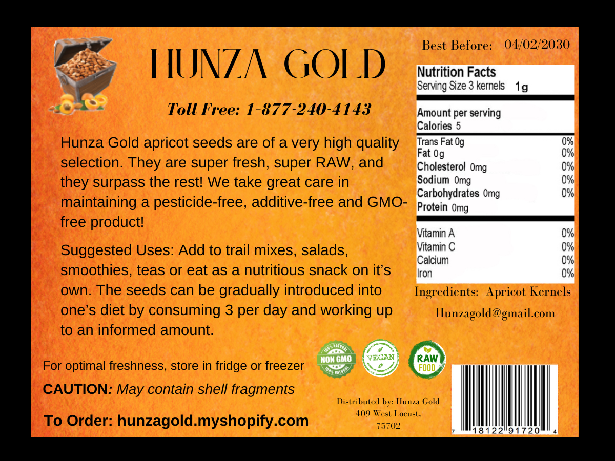 WE ARE HUNZA GOLD We are truly committed to bringing our loyal customers the best Apricot Kernels (seeds) we can source. We carefully select only the highest quality kernels from reliable sources. We have been in business for almost a decade and our loyal customers keep coming back to us for nutritious apricot kernels that you are sure to love. These Apricot Kernels are grown according to the higheste standards without the use of harsh chemicals, and are considered a "superfood" by many, and one of the top 10 super seeds according to some. What you’re buying here is Fresh, Vegan, Raw, Vitamin rich Apricot Kernels, containing naturally occurring enzymes. We recommend soaking in water for at least 6 hours. These are perfect to add to your favorite smoothie or just eat them raw! Taste that bitter flavor - that’s the way nature intended them to be. Bitter is Better – at least when it comes to quality Apricot Kernels!